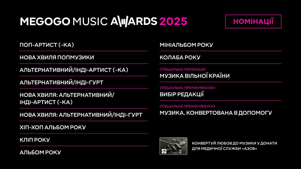 11 грудня, музична премія MEGOGO MUSIC AWARDS вчетверте об’єднує слухачів і артистів, щоб відзначити найкращих в українській музиці. Вже другий рік поспіль премія зберігає формат голосування донатами — щоб кожен міг не лише проголосувати за своїх фаворитів, а й зробити внесок оборонцям свободи й культури. Прихильники можуть подвоїти свій голос, зробивши донат на конверт для медичної служби «Азов».