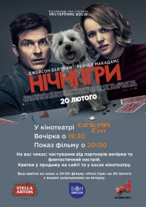 20 лютого, кінотеатр «СІНЕМА Сіті» (м.Київ, метро «Либідська», ТЦ Ocean Plaza, 3-ій поверх) запрошує на прем’єру кримінальної комедія «Нічні ігри» від режисерів Джона Френсіс Дейлі та Джонатана М. Голдштейн. Фільм розповідає про розслідування справжнього злочину замість азартної гри. Зйомки фільиу розпочалися у квітні 2017 та проходили у Атланті, штат Джорджія, а головні ролі дісталися володарю Золотого глобусу за кращу комедійну чоловічу роль Джейсону Бейтману та номінантці на премію «Оскар» 2016 року Рейчел МакАдамс.